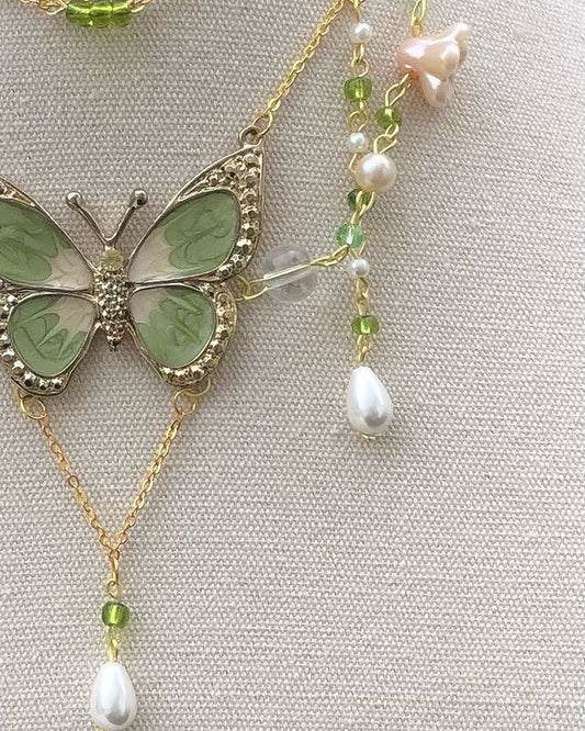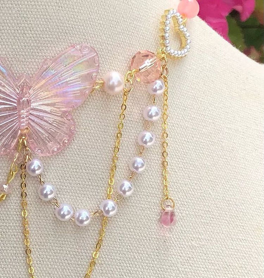 Ethereal Fairycore Asymmetrical Butterfly Faux Pearl Pink Golden Necklace