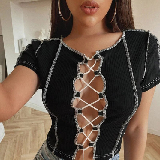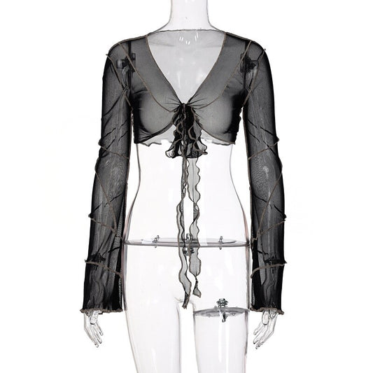 Mesh Tie Detail Deep V Neck Long Sleeve